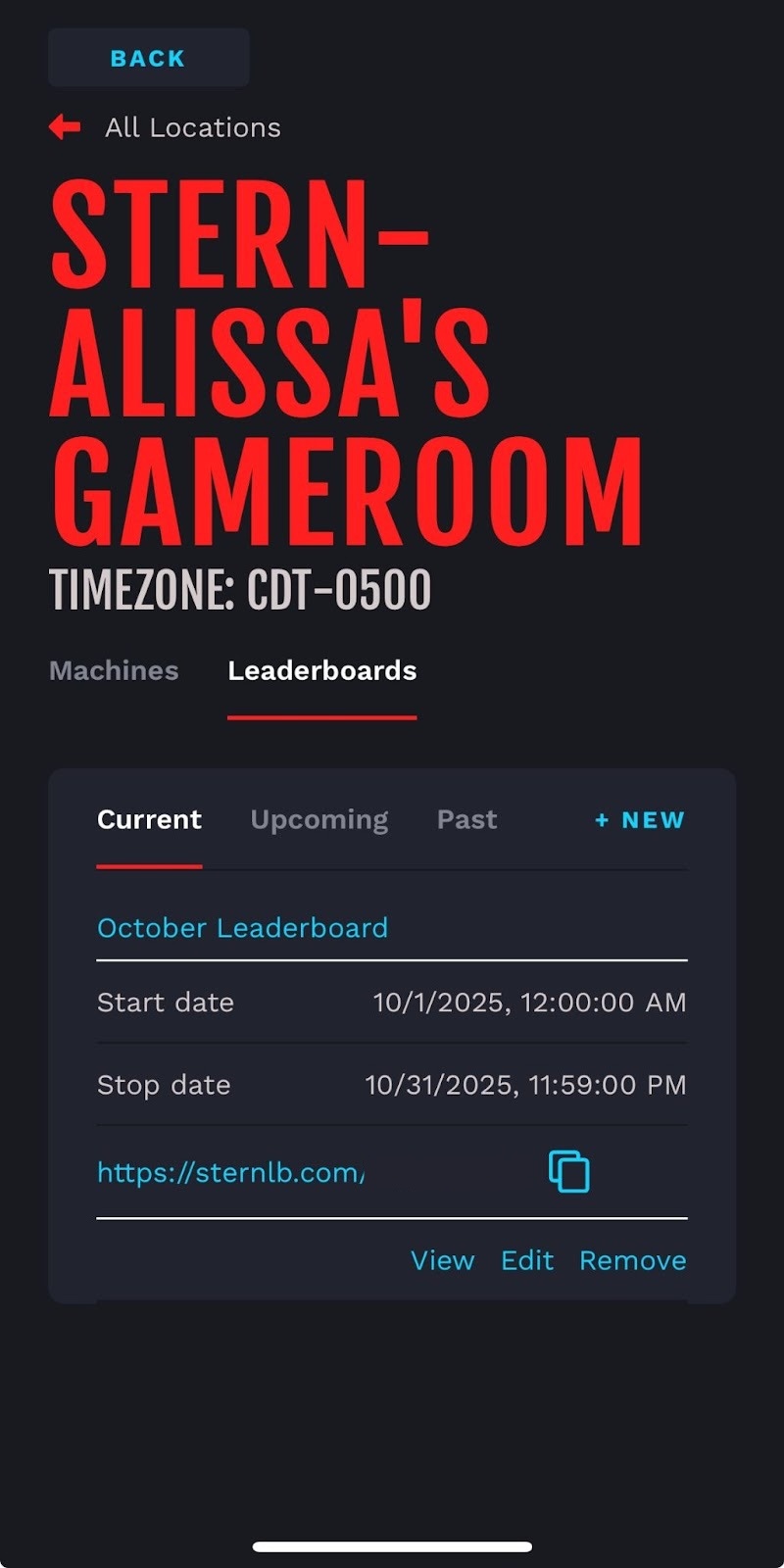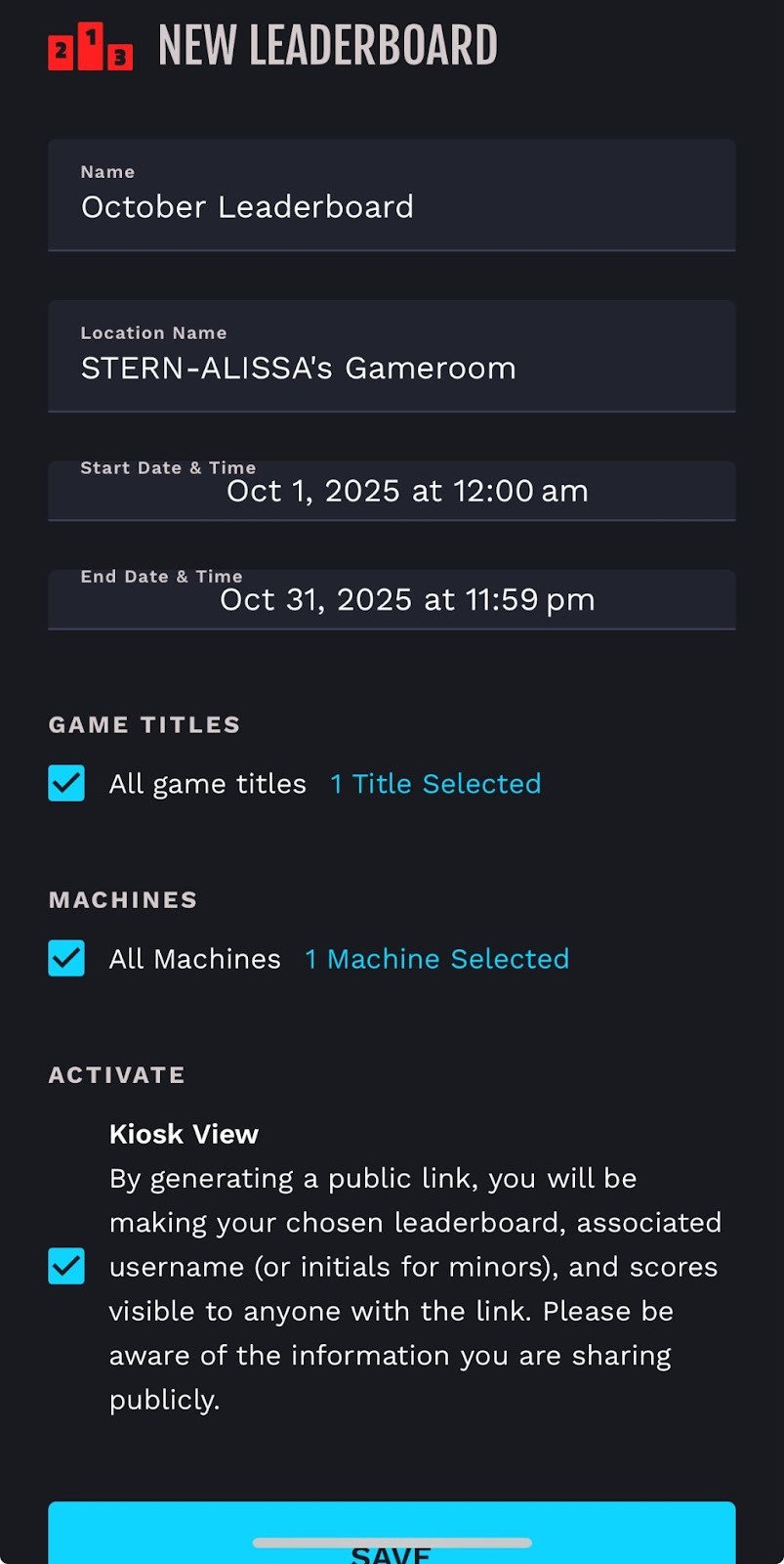 Step 4: Your new leaderboard is ready to go! It will only show up in the Play Now section of your Insider Connected app if you own it or have played on it. The kiosk link will allow you to display your leaderboard on a monitor.